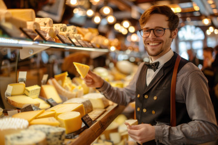 oung stylish cheese vendor, holding cheese in a European cheese store.