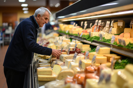 Elderly employee stocked cheese counter in supermarket