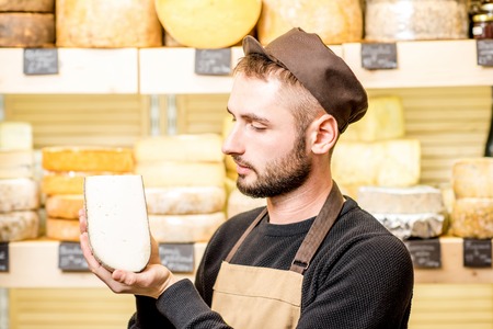 Portrait of a handsome cheese seller in uniform holding a peace of seasoned cheese in front of the store showcase full of different cheeses