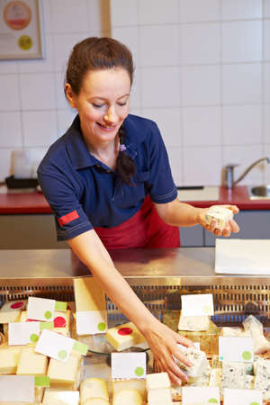 cheerful young shopgirl selling cheese
