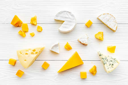High angle view of various cheese on white wooden table, copy space. unaltered, food and dairy product.