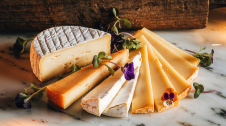 Variety of cheeses arranged on a marble surface, garnished with edible flowers, creating an appetizing display
