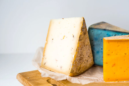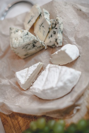 Unusual taste and quality of fresh farm products. Pieces of different fresh, aged, natural farm cheese in parchment paper on a wooden board.