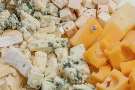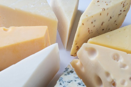 An assortment of cheese cuts is arranged on a white background, showcasing diverse cheeses Perfect for culinary or food-related projects.