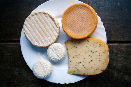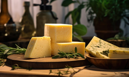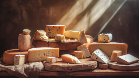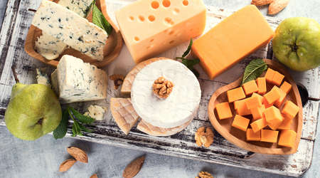 A variety of farm cheese, a natural dietary product, showcased on a rustic wooden board.