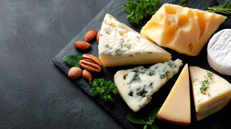 A visually appealing assortment of gourmet cheeses displayed on a slate board, accompanied by nuts and fresh herbs, ideal for entertaining.