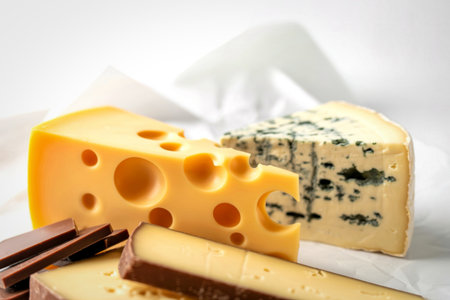 A close-up shot of various cheeses, including Swiss and blue cheese, alongside dark chocolate pieces on a white background.