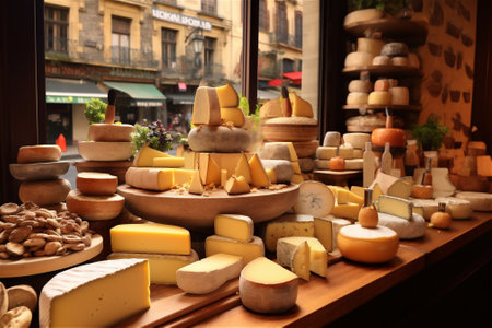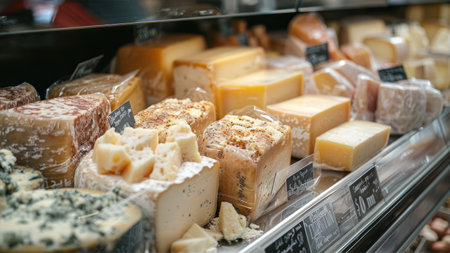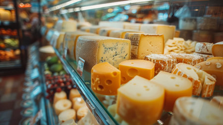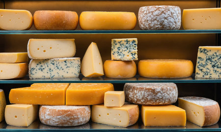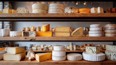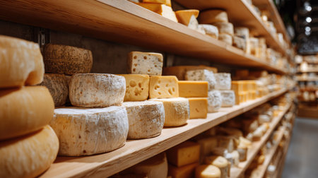 Shelves in a cheese store displaying a wide selection of cheeses, ranging from soft to hard, each one looking fresh and appetizing