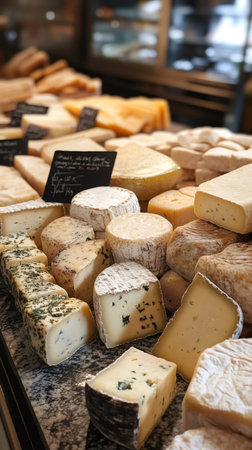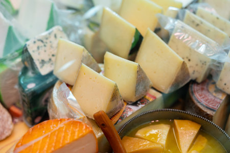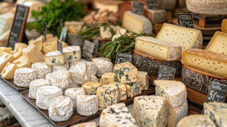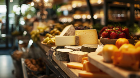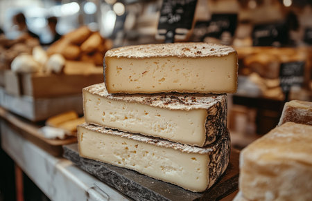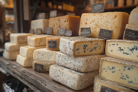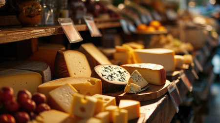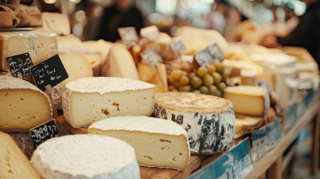 A vibrant cheese stall at a market, featuring a selection of fine cheeses with a blurred background that emphasizes the focus