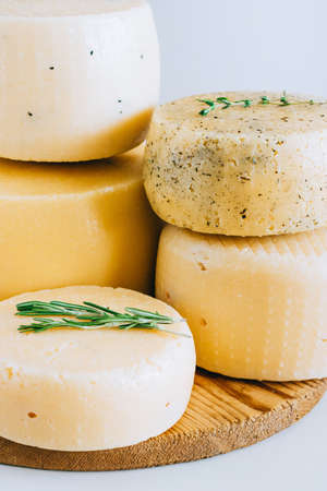 Assorted cachotta cheese head with black cumin, fenugreek and herbs on white background