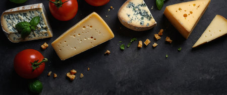 Cheese collection, various types of cheese on dark background, top view. ai generated