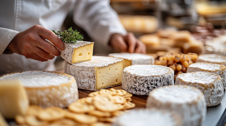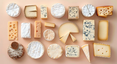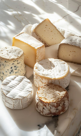 A variety of fine cheeses arranged on a white marble countertop under soft lighting. Generate Ai