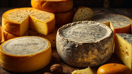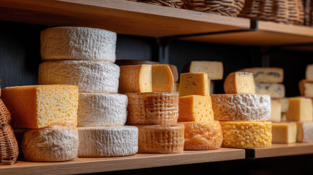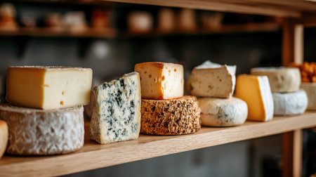 A row of artisanal cheeses of different shapes and sizes on wooden shelves, their rich textures and colors creating an inviting display