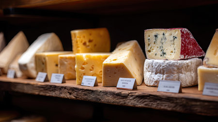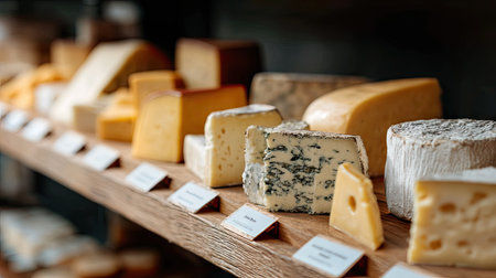 A selection of gourmet cheeses lined up on wooden shelves, each wedge carefully placed and labeled for easy identification