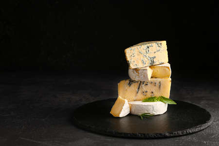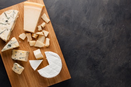 Tasting cheese dish on a wooden plate. Food for wine and romantic, cheese delicatessen on a dark stone table. Top view.