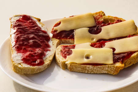 Preparing breakfast meal. Bread slices with butter, jam and cheese on white plate.