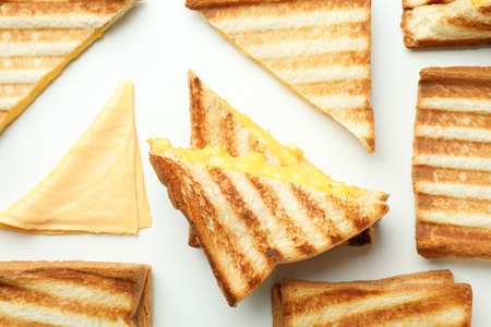 Toasted whole-grain toast with butter and maasdam cheese on a light background, top view