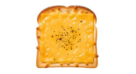 A single slice of toasted bread is covered with a square slice of bright orange melted cheese. The cheese is slightly browned at the edges and has a glossy, melted texture. Scattered across the surface of the cheese are specks of freshly ground black pepper. The toast has a golden brown crust and a slightly puffed interior. The image is presented on a black background.