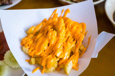 French Fried with Cheese Bread baked in the white plate on the wood table