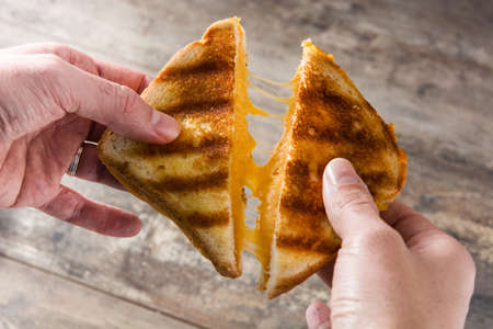 Two hands pulling apart a grilled cheese sandwich with melted cheese stretching between the two halves