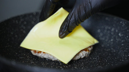 process of cooking hamburger. chef on the kitchen table making out the ingredients of the Burger. Beef Patty cooked on the coals.