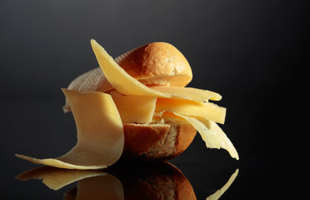 A large cheese roll is suspended mid-air, surrounded by various floating cheese fragments against a cloudy backdrop.