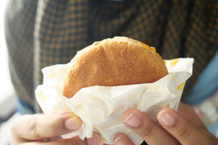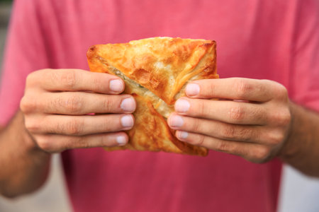 Guy's hand holds a puff pastry with cheese, snack and fast food concept. Selective focus on hands with blurred background and copy space for text.