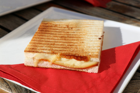High angle close-up view of fresh cheese sandwich served in plate on wooden table. unaltered, food, unhealthy eating and snack concept.
