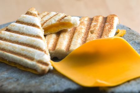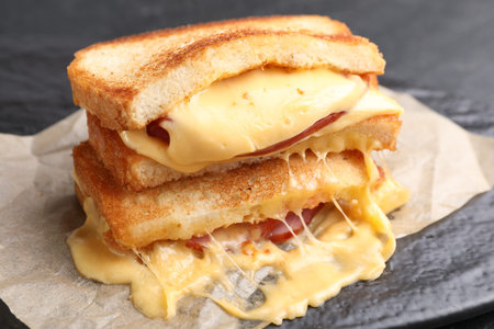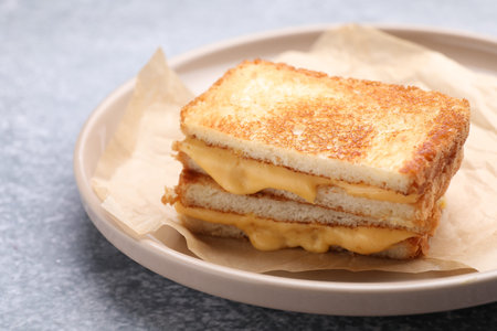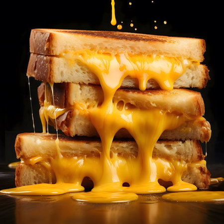 A close-up shot of a delicious grilled cheese sandwich with melted cheese dripping down the sides.