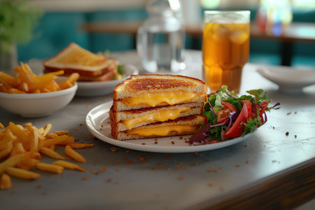 Gooey Grilled Cheese Sandwich Stack with Vibrant Salad and Refreshing Iced Tea on a Casual Table