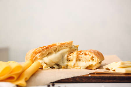 Close-up of fresh cheese sandwich stack served on wooden serving board. unaltered, food, unhealthy eating and snack concept.