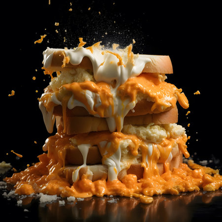 A close-up image of a melted cheese sandwich, with dripping cheese and a dark background. The sandwich is stacked with multiple layers of bread and cheese.
