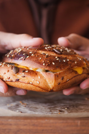 A Deliciously Freshly Baked Sandwich Generously Filled with a Variety of Seeds Held by Hands
