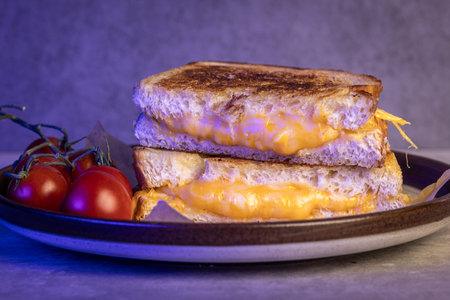 A toasted whole grain grilled cheese sandwich with melted cheddar and crispy crust, warm comfort food craving satisfied
