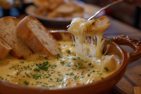 Closeup of melted cheese fondue being scooped with bread, garnished with herbs