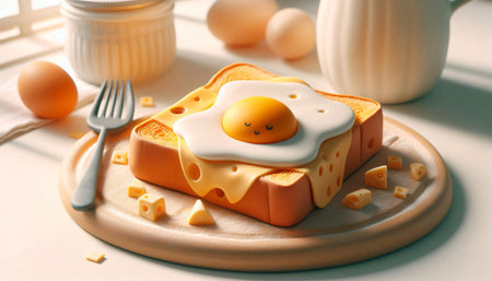 Fried eggs in toast. Serving breakfast. Plate and appliances. Hard cheese with big dork.