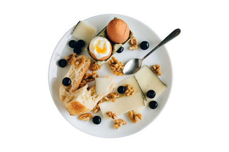 #3468 Meal, white plate with eggs, cheese, bread and fruit isolated on a transparent background
