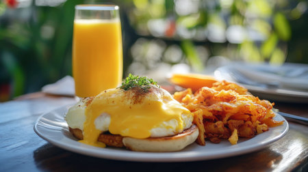 A classic breakfast setup with eggs benedict, crispy hash browns, and a glass of freshly squeezed orange juice.