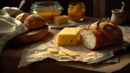 Freshly baked bread with piece of cheese on kitchen table. Homemade bakery food. Generative AI art