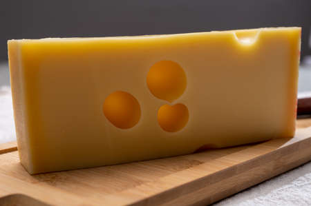 Block of Swiss medium-hard yellow cheese emmental or emmentaler with round holes close up