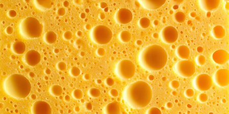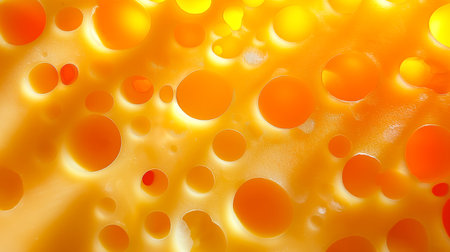 Detailed Closeup of Perforated Yellow Cheese Surface, Smooth Texture with Round Holes and Full Frame