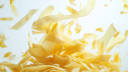 Dynamic and artistic depiction of thin yellow pasta strands swirling in mid-air, showcasing vibrant colors and textures perfect for a culinary or food-themed project.