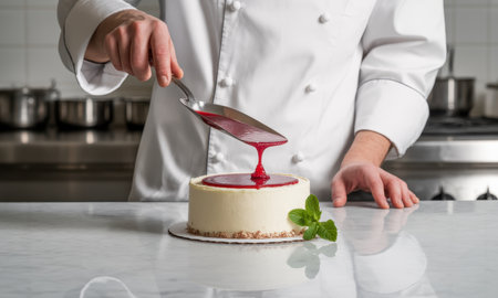 Professional pastry chef hands carefully spreading vibrant red raspberry coulis over a smooth white mousse cake, garnished with fresh mint, on a marble counter in a kitchen.