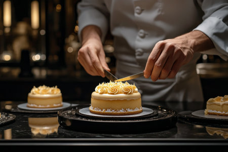 Pastry chef applies buttercream to cakes in restaurant kitchen
