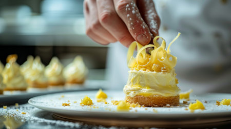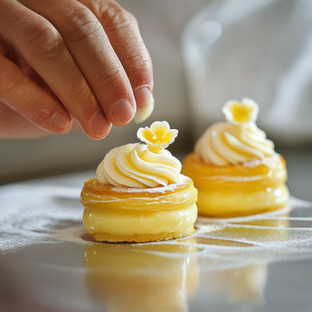A pastry chef's hand applies an intricate garnish to a lemon dessert, showcasing the art of fine patisserie against a backdrop of more confections.
