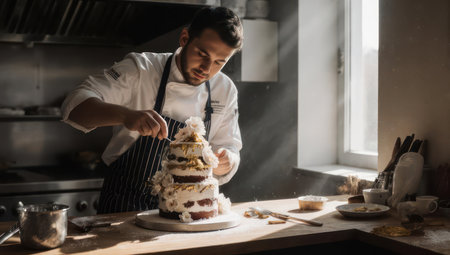A skilled male confectioner in a professional uniform carefully assembles and decorates a tall, rustic, multi-layered cake on a wooden countertop by a bright window.