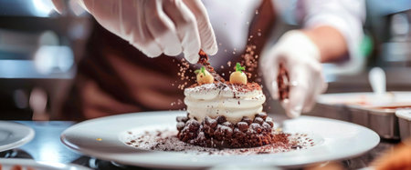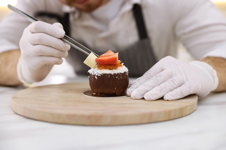 Closeup of a concentrated male pastry chef decorating dessert in the kitchen