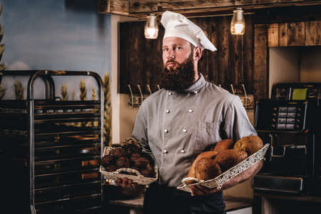 Handsome bearded chef in uniform showing tray of fresh bread in the kitchen of bakery.