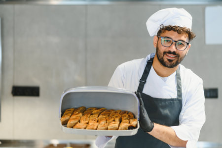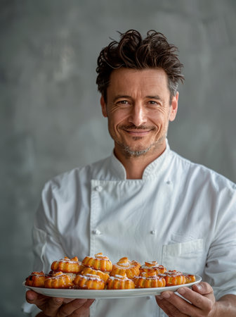 In a bustling kitchen, a smiling chef holds a tray of golden pastries just out of the oven, showing his culinary skills and attention to detail.