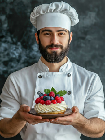 Male chef cook uniform holding the dessert cake on the plate, generative AI
